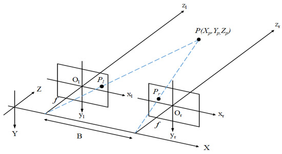 The distance connected component algorithm is mainly divided into three steps—distance calculation, ground edge contour removal, and distance object labeling. During distance calculation, the edge pixels of the edge image are used as the processing pixels, and the image matching method is used to compare the displacement between IR and IL, and calculate the disparity value which represents the distance to the camera. The larger the disparity value, the closer the distance to the camera; the opposite is true. As shown in Figure 3, we assume that there is a point P in the space, and its positions in the images of the left and right cameras are Pl (ul, vl) and Pr (ur, vr), respectively. The disparity value d can be obtained using Equation (1). Subsequently, the distance to the camera can be calculated using Equation (2), where Z is the distance from point P to the camera, B is the distance between the two cameras, and f is the focal length.
