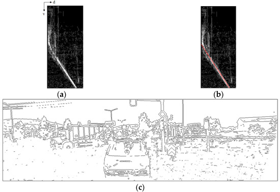 Then, ground edge contour removal is performed to avoid improper merging of edge contours in places where the object is in contact with the ground. First, the V-disparity method [35] is used to produce a projection map of the calculated disparity values of all edge pixels, as shown in Figure 4a, where the d-axis represents the change in disparity value and the v-axis represents the vertical coordinate of the image. The V-disparity map summarizes the change in disparity value of edge pixels in each row along the v-axis. If there is an edge contour of the ground, there will be a distribution of oblique line segments on the V-disparity map. Then, the Hough Transform [36] is used to analyze whether there are oblique line segments in the V-disparity map. If there are oblique line segments, the edge pixels distributed in this area are deleted. The red line shown in Figure 4b is the longest oblique line segment detected. Figure 4c is the edge image after the ground is removed, and the edge contours of some objects in contact with the ground (e.g., a car tire, signal pole, and telegraph pole base) are also filtered out. Although there will be a small error in the height measurement of the object, the reduction of these edge contours does not affect the subsequent object segmentation.
