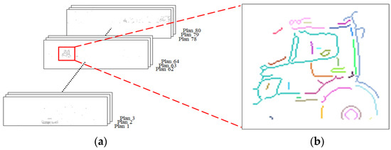 All objects in Figure 7b classified into different single-distance planes. (a) All distance planes; (b) Enlarged view of part of Plane 62.