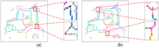 Subsequently, the single-distance plane line segment extension is processed to merge the fragmented line segments. The single-distance plane line segment extension mainly focuses on the line segments that are classified to the same distance plane and merges line segments that meet the extension connection condition. Before the processing, all objects should be arranged into planes with different distances based on the distance of objects. The minimum distance between the two endpoints of the line segment in each object is defined as the object distance. Therefore, objects with endpoints of the same minimum distance are classified into the same distance plane. Then, the line segment extension is processed for each distance plane in sequence. Because the object distances are calculated by Equation (2), the number of disparities will decide the number of distance planes. In Figure 7b, the range of the disparities is from 1 to 80. Therefore, Figure 7b can be classified into 80 distance planes. All objects in Figure 7b are classified based on the object distances. As shown in Figure 8a, 2663 objects are classified into 80 distance planes, where all planes are arranged in sequence. That is, Plane 1 is the closest plane, Plane 2 is the second plane, and Plane 80 is the farthest plane. We use the object in Plane 62 as an example and zoom in on the object for illustration, as shown in Figure 8b. In the figure, different colors represent different contour line segments. This object is a truck, and its body and the shooting position have different distance values. Therefore, only the edge contour of the front of the truck is in Plane 62, and the other contours of the body are classified into different distance planes. It can be observed from Figure 8b that the line segments of the front of the truck have fragmentation problems. The line segments can be extended and merged in this process.