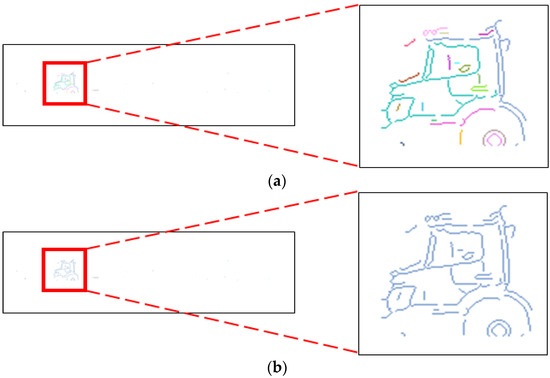 Figure 12a shows the extension connection judgment result of Plane 62 in Figure 8b. After the extension connection judgment, each object is composed of different line segments. Therefore, the third step, that is, overlapping object processing, is performed to merge different line segments of the same object on a single distance plane into the same object. The line segments are merged based on the overlapping characteristic of adjacent objects. Hence, the adjacent objects with overlapping bounding boxes are merged and the label number of the small object is changed to be the same as that of the large object. The bounding box coordinate record of the merged object is modified and the endpoint record of the two objects is retained. Figure 12b shows the result of Figure 12a after overlapping object processing. Different contour line segments of the front of the truck can be merged into the same object. Figure 12c shows the processing result of the single-distance plane line segment extension. Here, 2663 objects are merged into 1146 objects after the single-distance plane line segment extension.