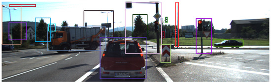 It can be observed from Figure 13 that large amounts of background noise are retained. The general practice is to set a threshold to filter the objects with a small number of pixels; however, the size of the same object in the 2D image is different at different distances. Therefore, the filtering method may incorrectly filter out distant objects. The proposed algorithm uses the 3D information of an object to determine whether to retain the object, to eliminate the object filtering error. In the proposed algorithm, two predefined thresholds are provided to filter out the noises. The two thresholds are the maximum detection distance and minimum reserved area. The objects with a distance less than the maximum detection distance and an area larger than the minimum reserved area are retained as the foreground objects, and the rest belong to the background image. In the experiments, the disparity value used as the maximum distance for effective detection is set as 5, and the distance calculated by Equation (2) is the maximum detection distance. Considering the retained object size is different for indoor and outdoor, the minimum reserved area of indoor and outdoor scenes is set to 25 cm2 and 600 cm2, respectively. Based on the relevant parameters of the KITTI camera system, the calculated maximum detection distance threshold is 77.3 m, and the minimum reserved area is 600 cm2. There are originally 821 objects, as shown in Figure 13. After the threshold filtering, 16 foreground objects are retained, as shown in Figure 14.