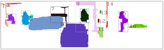 Finally, the cross-distance plane line segment extension is performed, and the main purpose is to judge each edge line segment in different distance planes and merge the line segments that satisfy the cross-plane extension connection condition. During the cross-distance plane line segment extension, planes are processed from nearest to farthest. First, all the endpoints of an object in Plane 1 are obtained and it is determined sequentially whether an extension object exists in Plane 2 in the extension direction of each endpoint. If there is no extension object, continue to process the next object of Plane 1. If an extension object exists, the extension connection judgment is performed based on the two characteristics of a line segment, the closure property, and color continuity. Finally, the extension object with the line segment closure property and line segment color continuity in Plane 2 is extended and merged with the object in Plane 1. The label number of the extension object in Plane 2 is changed to be the same as that of the merged object in Plane 1. The record of the two extended and connected endpoints is canceled, the bounding box coordinate record of the merged object is modified, and the labeling data of the two objects are retained. Then, repeating the above process of cross-distance plane line segment extension using Plane 3 and the merged plane of Planes 1 and 2 until all the planes are processed. Figure 13 shows the result of the cross-distance plane line segment extension. Here, 1146 objects are merged into 821 objects after the cross-distance plane line segment extension.