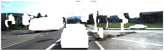 The KITTI dataset includes images captured by vehicles driving on outdoor roads. The Point Gray Flea2 color cameras (FL2-14S3C-C) and the 1/2″ Sony ICX267 CCD sensor are adopted. The focal length is 4 mm, and the baseline is 54 cm. The first test image pair selected from the KITTI database is Test image 1, as shown in Figure 2a,b. The image resolution is 1242 × 375 pixels. Regarding related parameters, the maximum detection distance is 77.3 m, the separation distance is 30 cm, and the minimum reserved area is 600 cm2. Figure 15 shows the foreground objects segmented by the proposed algorithm. After foreground object segmentation, the remaining image is the background image, as shown in Figure 16.