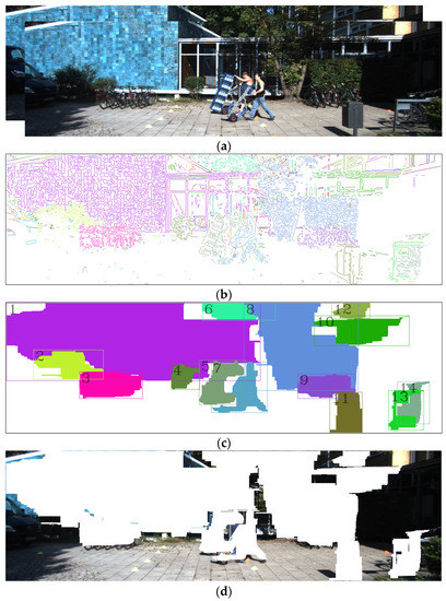 The second set of test images selected from KITTI is Test image 2, which is an outdoor scene beside the road. The experimental results of Test image 2 are shown in Figure 17. Figure 17a is the image pair. The image resolution is 1224 × 370 pixels, and the hardware parameters and the threshold values used by the algorithm are the same as those of Test image 1. Figure 17b is the detection result of the object edge contour. The object segmentation result is shown in Figure 17c, and the remaining image is the background image, as shown in Figure 17d. A total of 14 different foreground objects are detected and segmented from Test image 2.