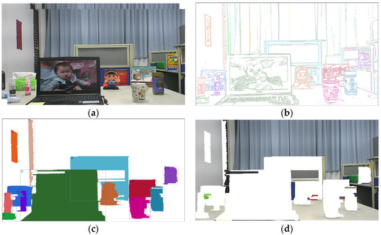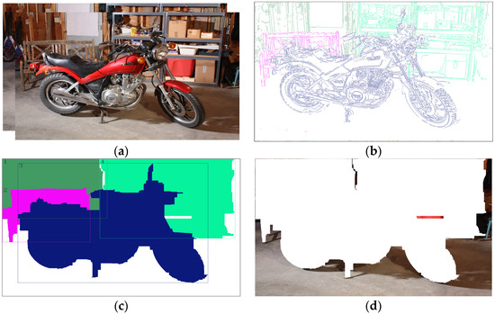 The Middlebury dataset includes test images captured in indoor scenes by Canon DSLR cameras (EOS 450D). The focal length and baseline are different for each set of the test images, and the provided focal length is converted to the pixel unit of each image. The first set of test images selected from the Middlebury dataset is Test image 3. The experimental results of Test image 3 are shown in Figure 18. Figure 18a is the image pair. The image resolution is 2964 × 2000 pixels, the focal length is 3979.911 pixels, and the baseline is 193.001 mm. Regarding relevant parameters, the maximum detection distance is 5.9 m, the separation distance is 10 cm, and the minimum reserved area is 25 cm2. Figure 18b shows the segmentation result of the object edge contour. The object segmentation result is shown in Figure 18c. The background image is shown in Figure 18d.