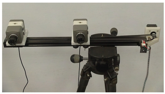 Because the above Middlebury and KITTI datasets did not provide the distance or the size of each object, this paper develops an image capture system to capture test images, as shown in Figure 20. Two Diamond color cameras (15-CAH22) are used, and the image capture card is an ADLINK PCIe-2602. The relevant hardware specifications are as follows: the sensor is a 1/3″ Panasonic CMOS, the image resolution is 1920 × 1080 pixels, the camera pixel size is 2.5 μm × 3.2 μm, and the focal length is 6 mm. Considering that the distance of the objects to be photographed in indoor and outdoor scenes is different, the baseline of the two cameras is designed to be adjustable. In Figure 20, the camera on the left is fixed. The camera on the right is controlled and adjusted to the desired position by the stepper motor, and the adjustable range is from 0–45 cm. In this paper, the baseline is a preset fixed value for outdoor or indoor scenes. Therefore, only two baselines are adjusted by the preset rotation angles of the stepper motor. The baseline of the outdoor or indoor is set to 300 mm or 50 mm, respectively.