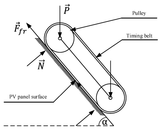Consider the cleaning robot in the stationary state on the PV panel with a tilted angle (), as shown in Figure 1. The cleaning robot is applied by the cleaning robot’s gravity (), the reaction force (), the static friction force between the belt and the panel surface () [55,56,57,58,59,60], and the elastic force of the timing belts (). According to the no-slip condition, the greater the static friction, the larger the slip resistance. On the other hand, the static friction force must be larger than the cleaning robot’s gravity to ensure the no-slip condition of the cleaning robot.