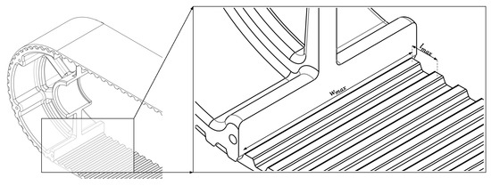 Equation (17) shows that there is a correlation between the effective area (A) and the displacement (). The effective area A is formed by the gravity force of the cleaning robot reacting to the contact area between the timing pulley and the rubber track belt (Figure 5).