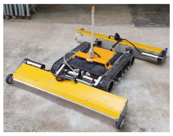 Some researchers have studied the degradation of PV panels output [18,19,20] under the accumulated dust. In Europe and the Middle East, the efficiency of dirty PV panels decreases by 3–6% per year, while it has decreased by more than 30% in India and the Arabian Peninsula [21,22,23]. For tropical countries such as Thailand and Vietnam, this is problematic, with the efficiency of solar cells decreased by 35% [24]. The work [25] has pointed out that a clean PV panel can improve performance considerably and yield more than the dirty one. Some of the cleaning methods for PV panels, such as rainfall cleaning [26,27,28], labor-based cleaning [29], and mechanized cleaning [30,31], were introduced in the past. The rainfall cleaning method requires a large tilted angle of PV panels that are not costly to clean and mitigate loose dust on the PV surface. However, the disadvantage of this method is that it depends on the rainfall intensity at the installation site. If the rainfall is insufficient, it will cause sludge formation on the PV panel, or only large particles will be removed [32]. Thus, the rainfall cleaning method has low efficiency and is mainly adopted in areas where it is hard to reach for maintenance [33,34]. The labor-based cleaning method requires costly time, human resources, water, and cleansing facilities [35]. This cleaning method can improve the conversion efficiency and cool down the PV panel [36,37,38,39,40], but it is an expensive cleaning cost compared to the rainfall cleaning method [41]. Furthermore, cleansing facilities might scratch the dry PV panel surfaces [35]. As well, human workers cannot maintain their focus on work due to declining physical conditions under the prolonged cleaning time. Mechanized cleaning methods employ motorized cleaning brushes or portable cleaning robots [42,43,44,45,46] and water supply to clean the PV panel surface [47]. The study [48] pointed out that this cleaning method should be applied to clean the PV panels once per week or daily when the rate of dust is intense. The benefit of the mechanized cleaning method is to cool PV panels with water, use automated operation by cleaning robots, and save human resources [49]. Alternatively, the PV cleaning robot can be classified into two categories. The first is to use two motorized trolley carriers clamping on the top and bottom edge of the PV panel [15] to move throughout the PV panel arrays, which is well-suited for mainstream power with massive concentrated PV panel arrays. The other is based on the structure of rubber wheel crawler robots, which is preferred for small-scale PV systems [29]. The advantages of this type of robot are portability and the ability to work with misalignment and uneven surfaces of PV panels. The drawback is that it requires human teleoperation, and the cleaning robot might slip on a wet tilted PV panel.