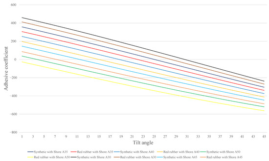 For a given shore hardness, there exists a maximum tilted angle in such a way that Equation (24) is satisfied. Once the shore hardness is increased, the tilted angle of the PV that the cleaning robot can move without slippage decreases. Figure 7 illustrates the adhesive coefficient with respect to the tilted angle of the PV that enables the cleaning robot to move without slippage, corresponding to synthetic/red rubber of varying shore hardness in a range of A30–A50. The maximum tilted angle that the cleaning robot can move without slippage with respect to the coating materials is briefly described in Table 2.
