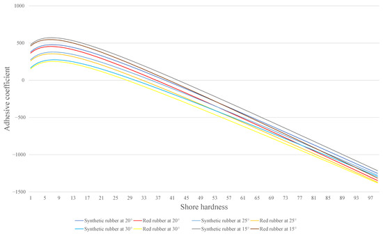 Equation (5) implies that the spring stiffness (K) and the displacement () of the equivalent model and the static friction coefficient () should be known to determine the adhesive bonding of the cleaning robot and PV surfaces. These parameters strongly depend on the hardness of the rubber material coating on the rubber track belt. Similar to the material used for the tires, it is made of rubber with variable hardness, according to [63]. From the perspective of anti-slip, the key feature of each type of material is the coefficient of friction between its contact surface and the PV panel surface. According to the experimental research [64], the static friction coefficient () is a function of shore hardness. The function is simplified in the linear form as follows: