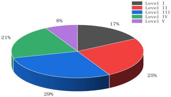 Stadium fire risk class is the predictive attribute that measures the risk level of casualties and property losses in the event of a fire in a stadium. According to Table 1, there are five stadium fire risk classes [6] as stratified by severity: Level I (not at risk), Level II (Low risk), Level III (Medium risk), Level IV (High risk), Level V (Extremely high risk). Figure 1 shows the distribution of risk levels for stadiums. To avoid over-fitting in the training and testing phases, the five-fold cross-validation and Stratified five-fold cross-validation techniques were used to randomly divide the dataset into five equal-sized subsamples.