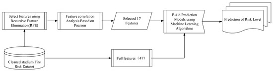 The goal of this study is to identify significant features and machine learning algorithms for building an optimal classification model to predict the level of fire risk in stadiums. During the data preparation phase, the quality of the dataset is assessed based on the percentage of missing values and is preprocessed to become a clean dataset (data cleaning). Next, since the unit measurement of various fire risk attributes is not uniform, the design index can quantify the threshold interval and perform the numerical quantification of the index (data conversion). In the modeling stage, through feature selection methods and correlation analysis, significant features were selected for experiments, and 12 risk prediction models were established by using two cross-validation techniques and six machine learning algorithms. The significant features were replaced with full features (47 features) and the same technical operations were performed to conduct model comparison studies. Finally, different indicators are used to measure the performance of the prediction model in the evaluation stage, and the risk prediction model with the best performance is decided. Section 3.1, Section 3.2, Section 3.3, Section 3.4 and Section 3.5 describes data preprocessing, feature selection, feature correlation analysis, classification modeling, and performance measurement in more detail.