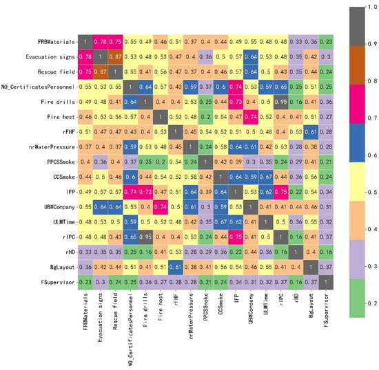 As shown in Figure 5, the correlation coefficient of the same feature on the diagonal is 1, and the closer the color of the matrix diagram is to black, the stronger the feature correlation and the positive correlation. The closer the color of the matrix diagram is to green, the stronger the feature correlation and negative correlation. The absolute value of the correlation coefficient between most features is less than 0.75. Exceptionally, the correlation coefficients of “FRBMaterials”, “Evacuation signs”, “rIPC”, and “Fire drills” are all greater than 0.75. Since rIPC, IFP, FRBMaterials, Rescue sites, and Evacuation signs are all significant indicators that affect the fire risk of stadiums, after detailed consideration and consultation with fire experts, these properties are preserved. The merged dataset contains 139 observations and 17 attributes as the final cleaned dataset.