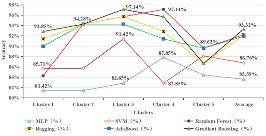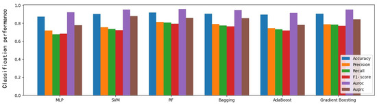 We divided our dataset into five clusters using stratified K-fold, making sure that the proportion of each category in the training set and test set remained the same as the original data set, each cluster giving a different accuracy. Table 6 and Figure 8 show the accuracy for each cluster and the mean using stratified K-fold cross-validation. Figure 9 shows other performance metrics of the six classifiers using stratified K-fold cross-validation.