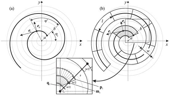 The locations of points , and at the start of the spiral are shown in the enlarged inset region in Figure 1b (they are denoted as and ). The distance between p and q is always equal to the width of the spiral segment, and the line that connects the two points is always perpendicular to the curve.