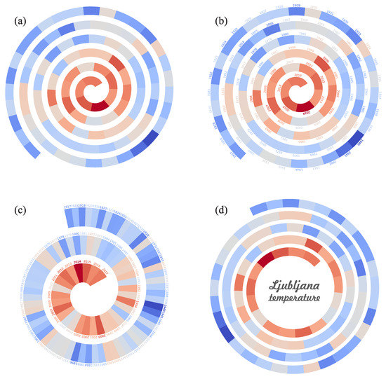 Four spiral strips all showing a hundred years of average yearly 2-m temperatures in Ljubljana in the period of 1917–2017. The colder years are represented in more bluish colors, and the warmer in more reddish. The time in all strips increases towards the center of the spiral. (a) shows a rather thin spiral strip that makes approximately five and a half loops around the center. (b) is identical to (a), except that labels were added near each segment indicating the year. (c) shows a strip with wider and shorter segments. (d) is similar to (a), except with the spiral strip starting some way off the center, and a label was added. For a more detailed description and discussion of examples, please refer to the text.