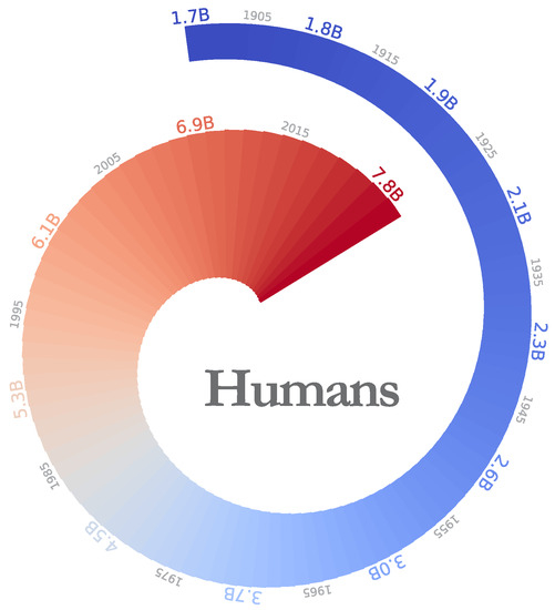 The last two examples are not related to climate. Figure 3 shows the increase in global population in the period of 1900–2021, with each segment representing one year. The image is based on the freely available population data published at ourworldindata.org (https://ourworldindata.org/world-population-growth (accessed on 30 January 2022 )). Their data are based on two sources, the UN World Population Prospects [9] and the Gapminder [10].
