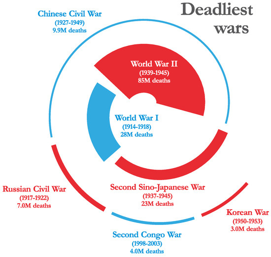 - Wikipedia. List of Wars by Death Toll. Available online: https://en.wikipedia.org/wiki/List_of_wars_by_death_toll (accessed on 1 February 2022).