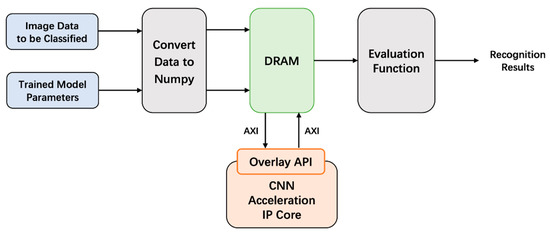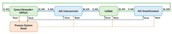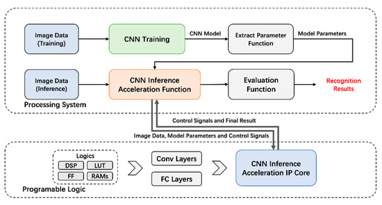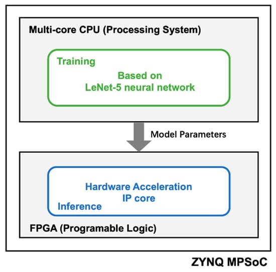 - Through advanced extensible interface (AXI) specifications, PS and PL were linked together to form a complete hardware structure for training and inference [38]. In this hardware structure, the CNN accelerator IP core was encapsulated into API functions that can be called directly by the Linux operating system, so as to constitute a complete implementation structure for training and acceleration.