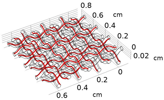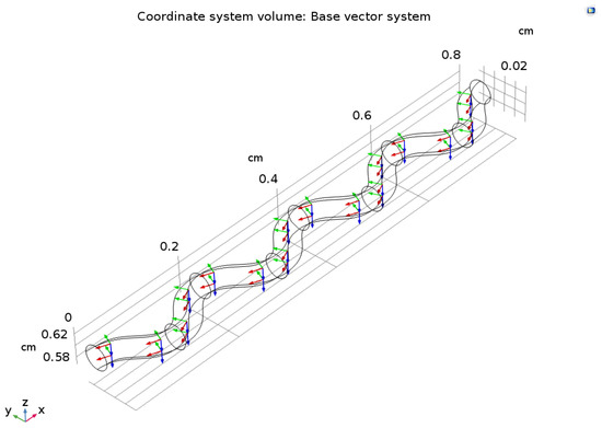 In general, thermal conductivity of a composite is highest along the plane direction compared to thickness. The matrix represented for K is provided x-component depending upon the shape of the fibers. The curvilinear coordinate provides such vector system for the interface. Three predefined methods could be able to function in the curvilinear coordinate system. In this system, the diffusion method has been used in a scalar potential. The streamline flow of heat represents along the direction of the carbon fiber. The base vector system for a single fiber is shown in Figure 3. The parameters used for the fiber axis are chosen with the specification as below a number of four loops considered along the fiber axis that determines a number of seven fibers per axis. The length of the loop is considered as 0.2 mm with an amplitude of 0.05. The curvilinear coordinates allow the inlet and outlet boundaries that allow the heat transfer in the direction of the composite (Figure 4). All other boundaries are thermally insulated walls. A Gaussian field of heat distribution in the center of the geometry is applied with a convective cooling boundary condition on both sides.