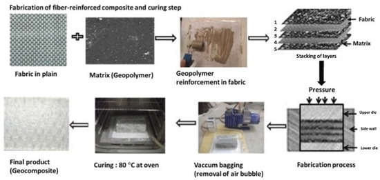 The composites were prepared by manually stacking 10 layers of carbon fiber impregnated with the geopolymer matrix. The fabrication steps are shown in a schematic diagram in Figure 5.