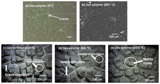 Surface morphology (a) geopolymer at RT shows the minor cracks; (b) geopolymer after exposure to temperature of various temperatures from (c–e) 200 to 1000 °C.