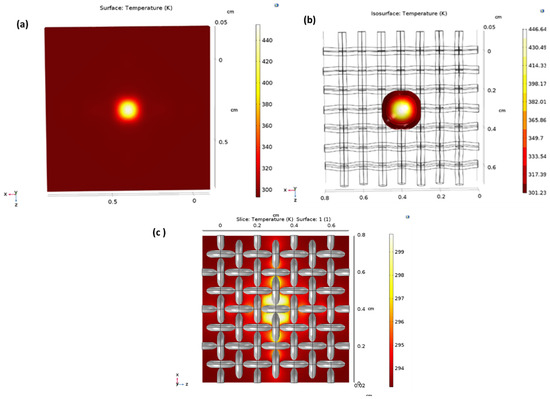 (a) Temperature distribution on the surface (b), with a fiber-oriented position (c) temperature at the center area with a fiber structure.