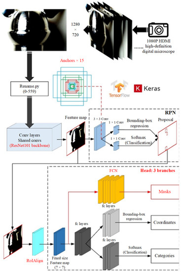 The equipment used in constructing the dataset was a 1080P HDMI high-definition digital microscope. All comparative experiments were conducted in the Pycharm2018 development environment using the Python 3.6 programming language. With the exception of the scripts of the JSON files for batch processing (.bash files) and labelme generation, which were written in Notepad++, all other scripts for data preprocessing (.py files) were written using Python3.6 in Pycharm2018. The dataset in the PASCAL VOC format was preprocessed by the labelImg labeling tool before being used in the Faster R-CNN, whereas the dataset in the COCO format was preprocessed by the labelImg labeling tool before being used in the Mask R-CNN. The deep learning environments included: CUDA 9.0.176, cuDNN 7.0.5, Tensorflow_GPU-1.7.0, Tensorboard-1.7.0, and Keras-2.2.4. The loss curve and the network structure diagram were monitored in Tensor board. Due to the limitation in laboratory equipment, the GPU used in the experiment was an NVIDIA GeForce GTX 1050Ti with a video memory of 4 GB.