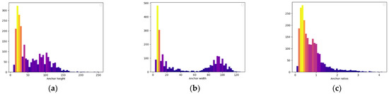 Size statistics of samples in collected dataset, the X-axis is the size of samples, the Y-axis is the number of samples: (a) anchor height statistics; (b) anchor width statistics; and (c) anchor ratio statistics.