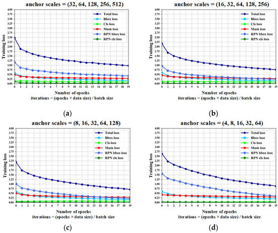 The anchor scales combination adopted by Mask R-CNN is (32, 64, 128, 256, 512). Combined with Figure 6 and Table 1, it can be found that the combination method of Mask R-CNN can cover 94.80% of the samples in height, but only 56.41% in width. The mismatch between the anchor design and the size of the labeled data directly leads to the poor performance of Mask R-CNN in engine surface defect detection. In order to solve this problem, this paper improves the anchor design, the anchor scales are set as (8, 16, 32, 64, 128, 256). This combination can cover 100% in height and 99.87% in width. In addition, the statistical analysis of the anchor ratios is shown in Figure 6c. The anchor ratios adopted by Mask R-CNN is (0.5, 1, 2), which can cover 95.91% of the samples. Therefore, these ratios are also adopted in our method. In order to verify the effectiveness of designing anchor scales based on labeled data distribution, we consider different anchor scales and compare the convergence performance, as shown in Figure 7.