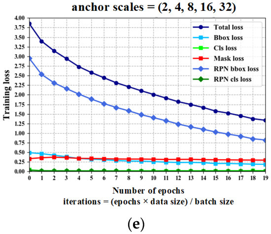 Network convergence curves at different anchor scales: (a) anchor scales = (32, 64, 128, 256, 512) (baseline); (b) anchor scales = (16, 32, 64, 128, 256) (one half of the baseline); (c) anchor scales = (8, 16, 32, 64, 128) (a quarter of the baseline); (d) anchor scales = (4, 8, 16, 32, 64) (one-eighth of the baseline); and (e) anchor scales = (2, 4, 8, 16, 32) (one-sixteenth of the baseline).