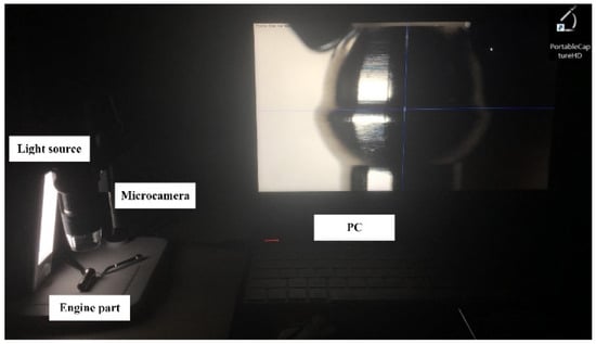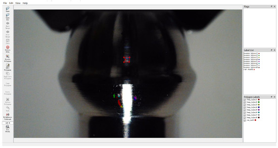 To improve the recognition of a defect area, an independently developed light source is used together with the camera sensor to obtain an image acquisition dataset. We design the independently developed light source based on the light emitting diode (LED) powered by a lithium battery. The volume of this light source is 305 mm × 49 mm × 28 mm, weighing only 200 g, which can be conveniently fixed on the side of the digital microscope. The entire equipment set is shown in Figure 10. Local image acquisition of bruise damage and machine marks was performed on 560 engine parts, and 560 valid images were obtained. The two categories of defects, namely the bruise damage and machine mark, were manually labeled to validate the effectiveness of the proposed method experimentally. The labeling diagram of automotive engine parts data using the labelImg tool is presented in Figure 11.
