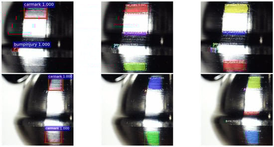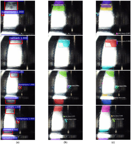To verify the effectiveness of the improved anchor points, after the dataset was constructed, 500 randomly selected labeled images were used for training, and the remaining 60 labeled images were used for testing. The surface defect detection accuracies of automotive engine parts of the Faster R-CNN, Mask R-CNN, and proposed IA-Mask R-CNN models were tested. Due to the limitation of the GPU memory, the batch size in the experiment was set to one. The VGG16 and ResNet101 were first pre-trained on the COCO dataset that contained 80 image categories [22]. The networks were then fine-tuned using the pre-training weights and, finally, the Faster R-CNN was iterated 80,000 times and the Mask R-CNN and IA-Mask R-CNN were iterated 10,000 times. The quantitative results are shown in Table 3.