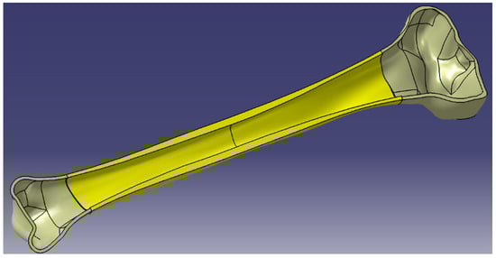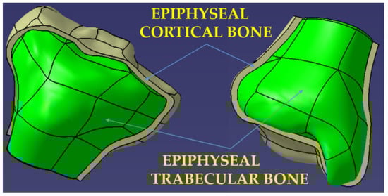 In order to obtain the models for the compact cortical bone area, a spatial off-setting (from the initial model) of the external surfaces of the two epiphyses was performed. The size of the offset, which represents the thickness of the cortical bone at the level of the epiphyses, was adopted of 2.5 mm, a value taken from the literature [].