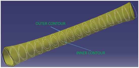 The diaphysis’ modeling was more complex due to its variable geometry. In order to obtain the real tubular structure, a sectioning of the initial model of the diaphysis was first performed, which has a length of 272 mm, with 17 planes perpendicular to the tibia, positioned equidistantly. In the case of the real diaphysis, each of these sections is characterized by an outer and an inner contour. Determining these contours and then linking them to CatiaV5R20-specific Solid MultiSection functions makes it possible to obtain the CAD model of the diaphysis entity.