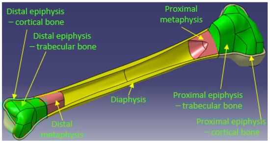 Thus, the 5 entities modeled in CAD are: proximal epiphysis—cortical bone, proximal epiphysis—trabecular bone, proximal metaphysis, diaphysis, distal metaphysis, distal epiphysis—trabecular bone, distal epiphysis—cortical bone.