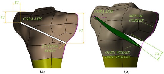 An important moment in the successful realization of the OWHTO is the creation of the correction angle, i.e., the creation of the osteotomy wedge (Figure 6b), after the realization of the cut of the osteotomy plane (Figure 6a). This can be achieved by elastic deformation of the bone with a specialized spacer []. In order to avoid microcracks that may appear in the CORA or in the articular area of the medial tibial plateau, it is essential to choose the correct lot of values for the 4 variables (V1, V2, V3, V4) that characterize the geometric planning shown in Figure 6.