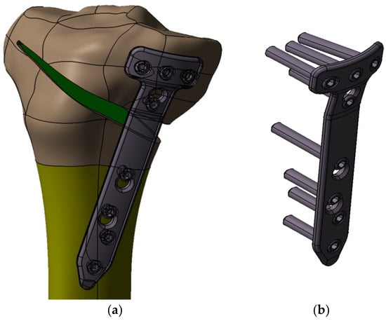 In order to complete the modeling of the OWHTO operation, CAD models were made for the 440.834S TomoFix osteosynthesis plate (standard) and the necessary fixing screws (Figure 7b), elements that preserve the obtained axial correction. The tibial model with the osteotomy pen created, the TomoFix plate and the screws were assembled according to the instruction on the surgical technique of the TomoFix Medial High Tibial Plate (DePuy Synthes; Synthes GmbH, Oberdorf, Switzerland) [] resulting in the 3D assembly from Figure 7a. The CAD models made and presented will be used as geometric models in the CAE simulations in the Section 2.2.
