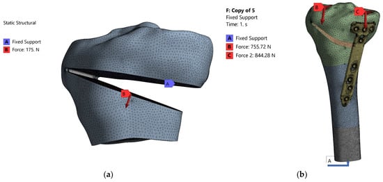 The known steps were taken to perform the FEM analysis. Thus, the geometric model developed in the CATIA V5R20 program and presented in Section 2.1 was imported as a geometric model using the STEP transfer standard and then discretized. Both modeled entities (cortical and cancellous) were considered to be homogeneous, isotropic and linearly elastic. Young’s modulus for the tibia was 17 GPa for the cortical, 5 GPa for cancellous bones and Poisson’s ratio was 0.33 [,,]. The model was discretized (meshed) and its constraints and loads were applied (Figure 8a). As this analysis was aimed at the intraoperative creation of the osteotomy wedge, the value of the applied force was 175 N. The value was chosen taking into account the values existing in the literature between 120–200 N [,]. Figure 8b shows the meshed geometric model to which the constraints and loads were applied. As can be seen, since the area of interest is the proximal one of the tibia, a section was made in the middle of the tibia and only the upper part was analyzed. According to the CAD modeling described above, the tibia is a set of three entities with different mechanical characteristics: proximal epiphysis—cortical bone with Young’s modulus 17 GPa, proximal epiphysis—trabecular bone with Young’s modulus 5 GPa and proximal metaphysis with Young’s modulus 1 GPa [,,]. For TomoFix plate the Young’s modulus was 110 GPa.