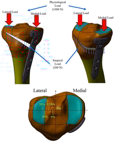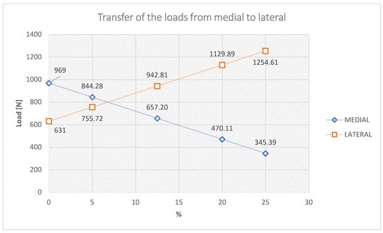 Figure 9 shows the loads on the tibial plateaus of a load of 1600 N consisting of physiological loads—1400 N and surgical loads—200 N [,,,], and Table 2 shows how the load transfer from the medial takes place to the side with the change in the position of the mechanical axis.