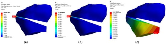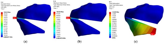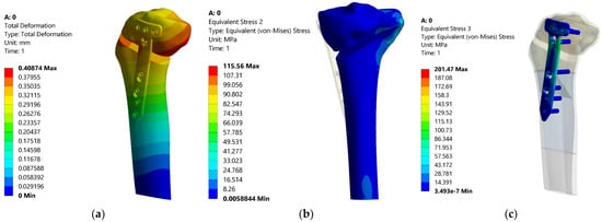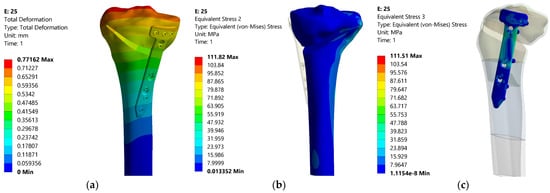 Table 9 shows the maximum total deformations and the maximum equivalent stresses for the main five positions of the corrected mechanical axis (0%, 5%, 12.5%, 20%, 25%). Figure 13, Figure 14 and Figure 15 show the distribution of total deformations (a) of equivalent stress states in the bone (b), and in the flat TomoFix (c) for three distinct positions: 0% overcorrection (Figure 13), Fujisawa Point 12.5% and the maximum overcorrection of 25%.