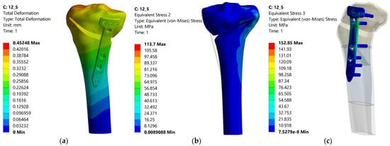 Distributions of the total deformation, equivalent stress in tibia and equivalent stress in the plate—12.5%.