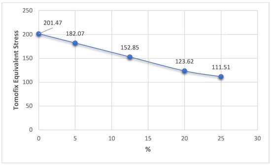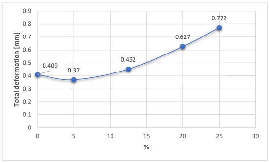 In the case of the TomoFix equivalent stresses, there is a more consistent, nonlinear variation of about 100 MPa but with the same tendency to decrease from 0% to 25% (Figure 18). It is also worth noting that for a 25% change in the position of the mechanical axis, an approximately equal distribution of stress is obtained in both the plaque and the bone, but with an increase in the total deformation of about 100% compared to the situation in which the change in the position of the mechanical shaft was only 5%.