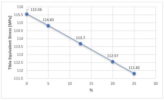 This first aspect reveals that the fixation of the TomoFix plate is a stable one because an almost constant equivalent stress can be noticed in the tibia bone regardless of the degree of overcorrection (Figure 17). The variation is a fairly small linear one between a maximum value of 115.56 MPa for 0% (i.e., without overcorrection) and a minimum of 111.82 MPa for a maximum overcorrection of 25%. The results thus confirm the research in [], which highlights the superiority and stability of TomoFix flat fixation relative to other fastening systems.