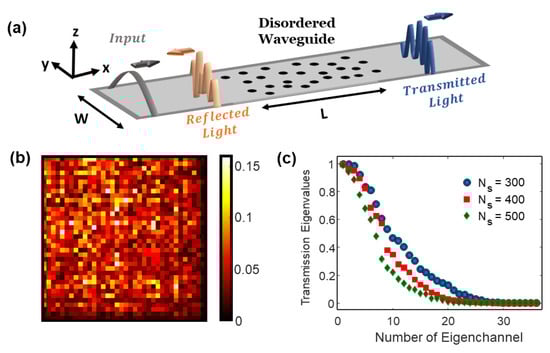 To calculate the transmission eigenchannels of the disordered waveguides, we used the recursive Green’s function method, as described in Refs. [,,]. First, we constructed the field transmission matrix t of the disordered waveguides, where t is a N × N complex matrix. The transmission matrix of the disordered waveguide gives the output field for any arbitrary input (Figure 1b). The transmission eigenchannels are eigenvectors of the matrix t†t and the eigenvalues are the transmittance of the corresponding eigenchannels (Figure 1c). In the lossless diffusive regime, the density of the eigenvalues follows a bimodal distribution where some channels, called “open channels”, have a transmittance/transmission eigenvalue ~1 and other channels have lower transmittance. The transmittance of the eigenchannels decreases exponentially with the index of the eigenchannel (Figure 1c). In the diffusive regime, the diffusion process is dominated by the open channels, and the average transmittance is the mean of all the transmission eigenvalues, which is proportional to the ratio of the number of open channels to the total number of propagating channels []. As the number of scatterers, Ns, is increased, due to enhanced backscattering, the transmission eigenvalues decrease in magnitude, which results in an overall decrease in the average transmittance (Figure 1c).