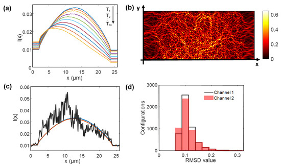 Numerical simulation of disordered photonic structures: (a) Numerically calculated spatial profiles of cross-section averaged intensity (proportional to energy density) of transmission eigenchannels with the ten highest transmission eigenvalues of disordered structures with Ns = 300. The different spatial profiles of the different transmission eigenchannels are shown in different colors. The intensities were averaged over 10,000 different random configurations. T1 corresponds to the eigenchannel with the highest transmission eigenvalue; (b) Numerically calculated two-dimensional intensity distribution of the transmission eigenchannel with the highest transmission eigenvalue T1 for a single random configuration with Ns = 300; (c) Cross-section averaged intensity distribution (corresponding to the two-dimensional intensity distribution shown in (b)) overlaid on the spatial profiles of transmission eigenchannels T1 ( blue line) and T2 ( red line) (a); (d) Histogram of the root mean square deviation (RMSD) values of 5000 configurations of the transmission eigenchannels with the highest transmittance (Channel 1) and second-highest transmittance (Channel 2). Both histograms have very similar spread and shape.