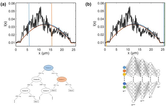 Diagrams explaining how the decision trees and neural networks were used for the classification task – the vertical-colored lines indicate the different intensity distribution values at different spatial points used for classification: (a) Diagram theoretically showing how the trained decision tree classifier can be used to classify an intensity distribution. Through training, the classifier creates the shown branching structure and learns which values of the distribution and which threshold value lead to the correct port number classification at the leaves of the tree; (b) Diagram theoretically showing how the trained neural network can be used to classify an intensity distribution. In the 451-neuron input layer, one value of the intensity distribution is assigned to one neuron in the order dictated by the distribution. Learned weights between the layers result in a 10-neuron one-hot vector with one port being marked as the predicted port.