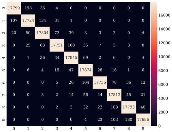 Finally, we tested the best neural network and decision tree classifier configurations on the first multilabel dataset with 30-component output vectors. The decision tree and neural network achieved 95.02% and 98.99% accuracy, respectively. Along with correctly identifying the port number, these model configurations allowed us to classify the disorder strength as well. The confusion matrices for the neural network and decision tree are shown in Figure 7 and Figure 8, respectively. The decision tree took about 5 h to train, which is 2.5 times longer than the neural network, most likely due to longer output vectors requiring more training time to generate more divisions in the tree. The decrease in the decision tree performance might be accounted for by the increased complexity of the tree, as more output classifications, 30 classifications instead of 10 classifications, are required.